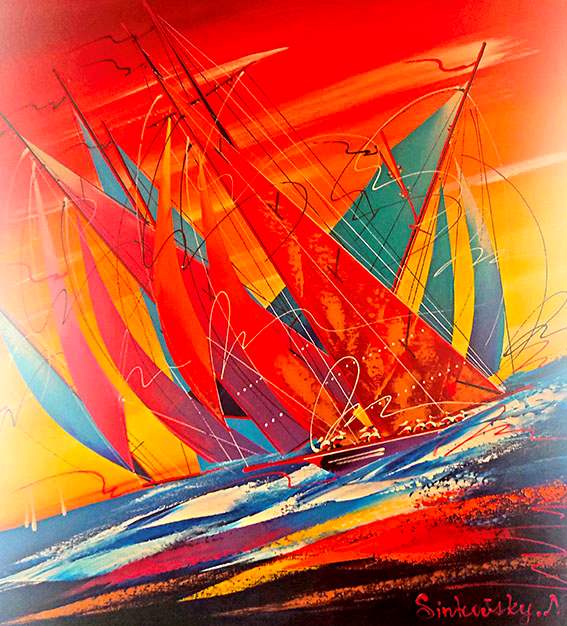Sinkovsky’s painting style is largely inspired by abstract art and modern design thanks to her background in architecture. In particular, her sailboat series draws from Expressionist, Baroque and Cubist art movements as well as architectural movements like Constructivism and Minimalism.
