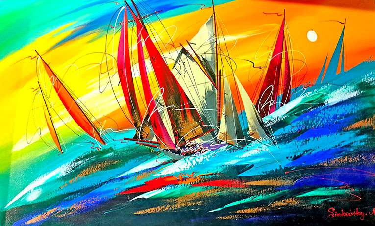 Israel not only provided a setting to launch her art career, but was also the source of what would become the inspiration for her sailboat series: The sea. She depicts colorful yachts rocking on the waves, the excitement of a boat race or a romantic sunset sailing trip.
