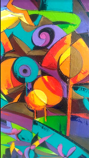 She uses a palette knife to apply thick layers of paint, and once the layers have dried, she returns to add graphic elements. Her palette reflects her optimistic view on life with the use of bright, cheerful colors such as blue, aquamarine, purple, red, yellow, pink and lilac.