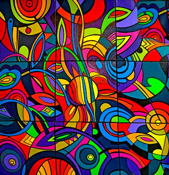 She uses a palette knife to apply thick layers of paint, and once the layers have dried, she returns to add graphic elements. Her palette reflects her optimistic view on life with the use of bright, cheerful colors such as blue, aquamarine, purple, red, yellow, pink and lilac.